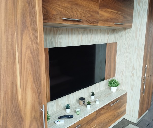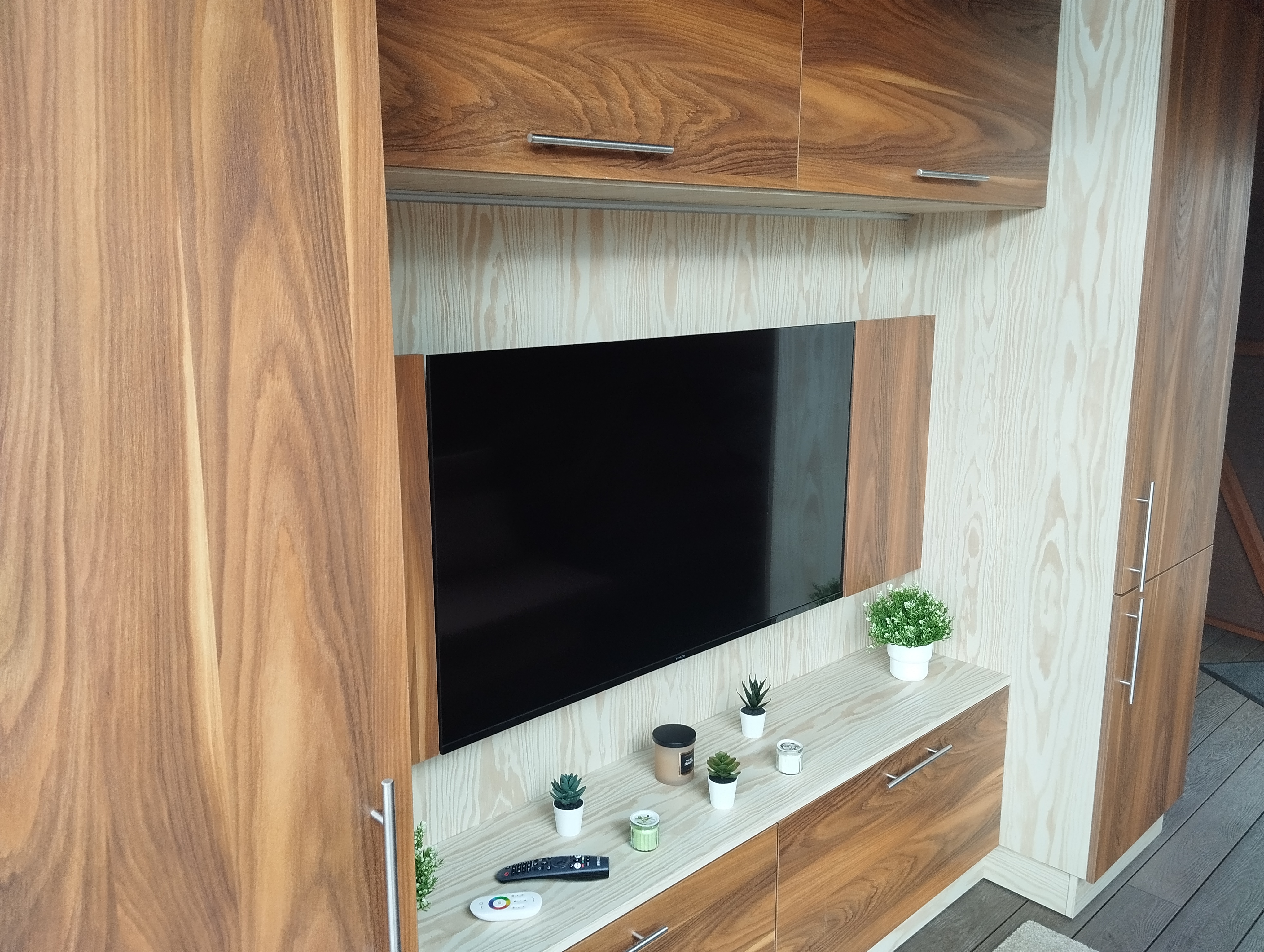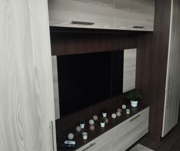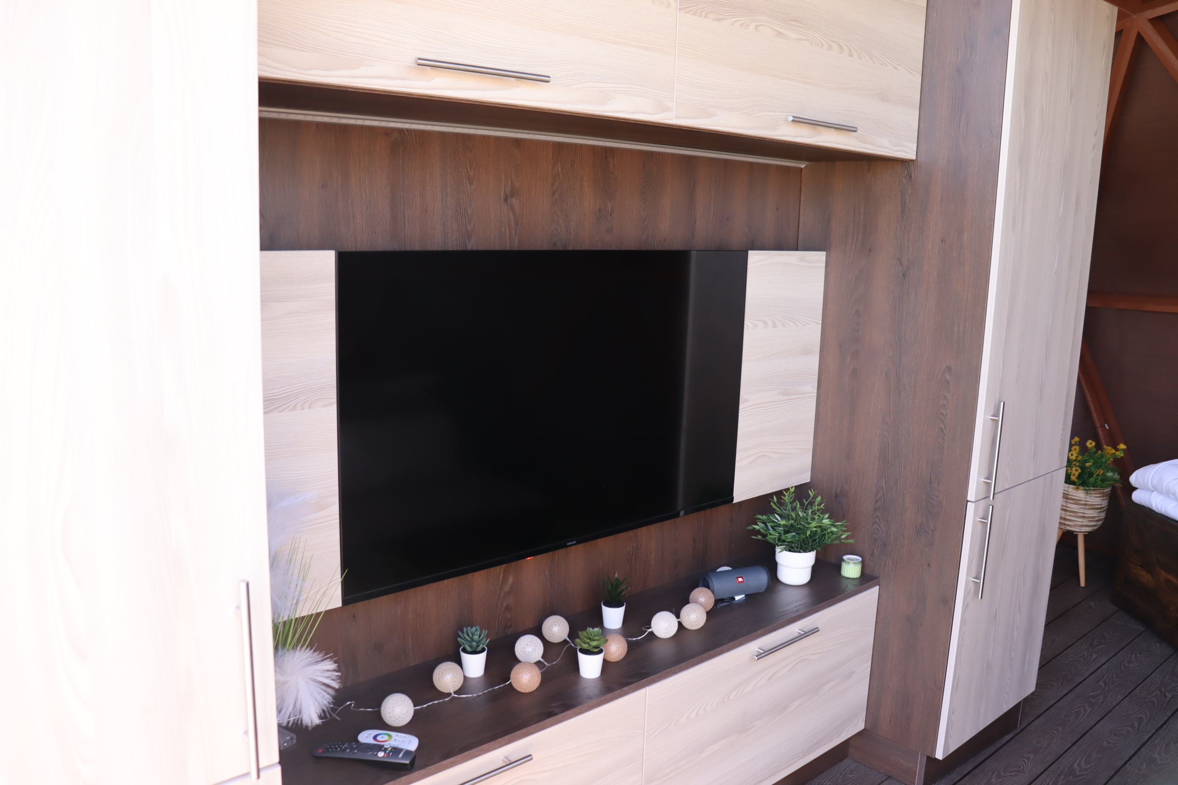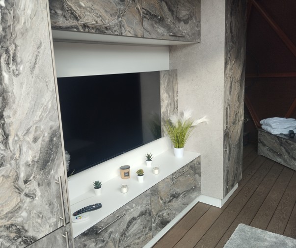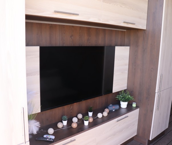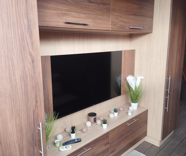 Obývací část - rozkládací pohovka, chytrý televizor s připojením na internet, reproduktor JBL k soukromému využití