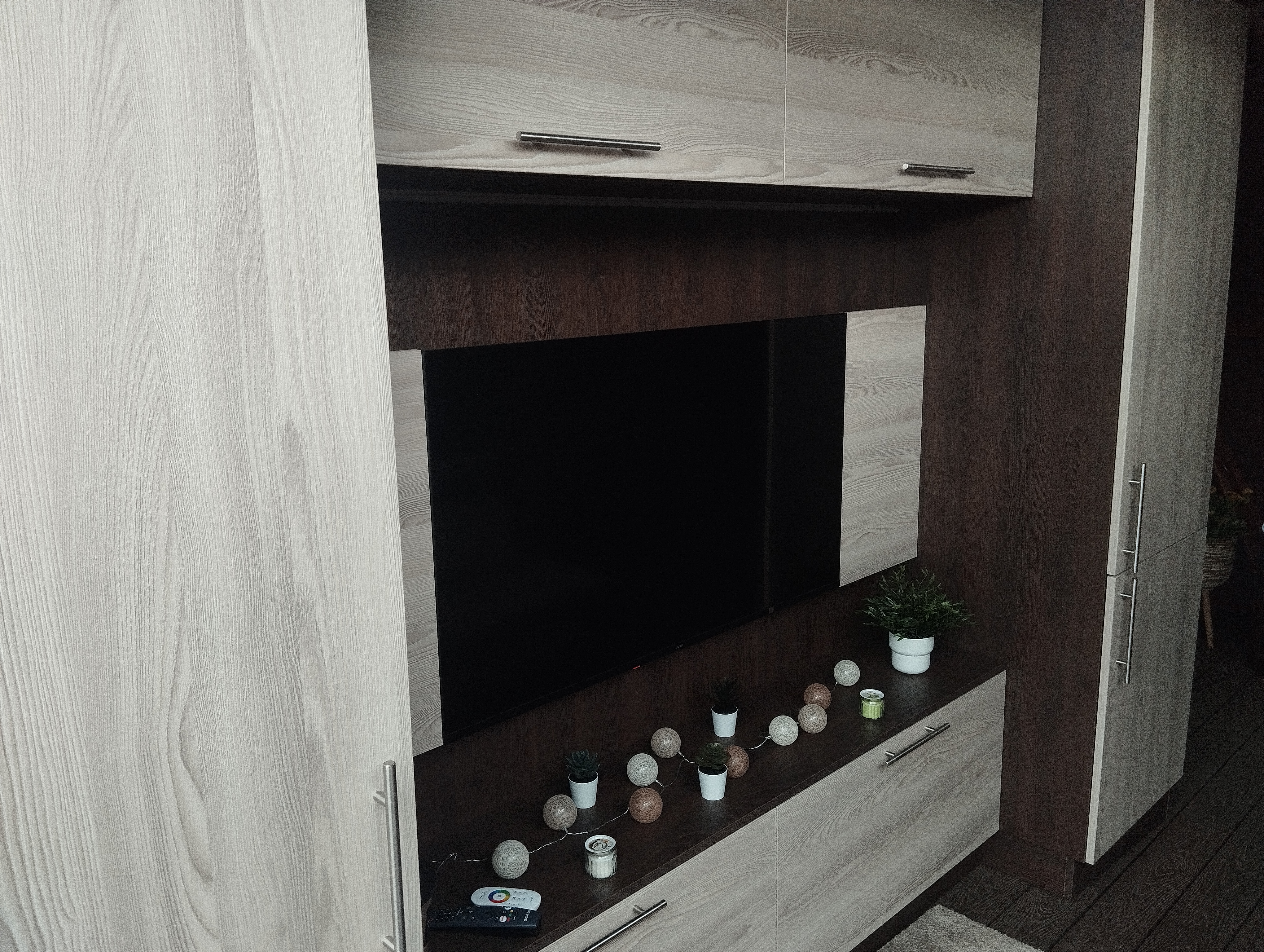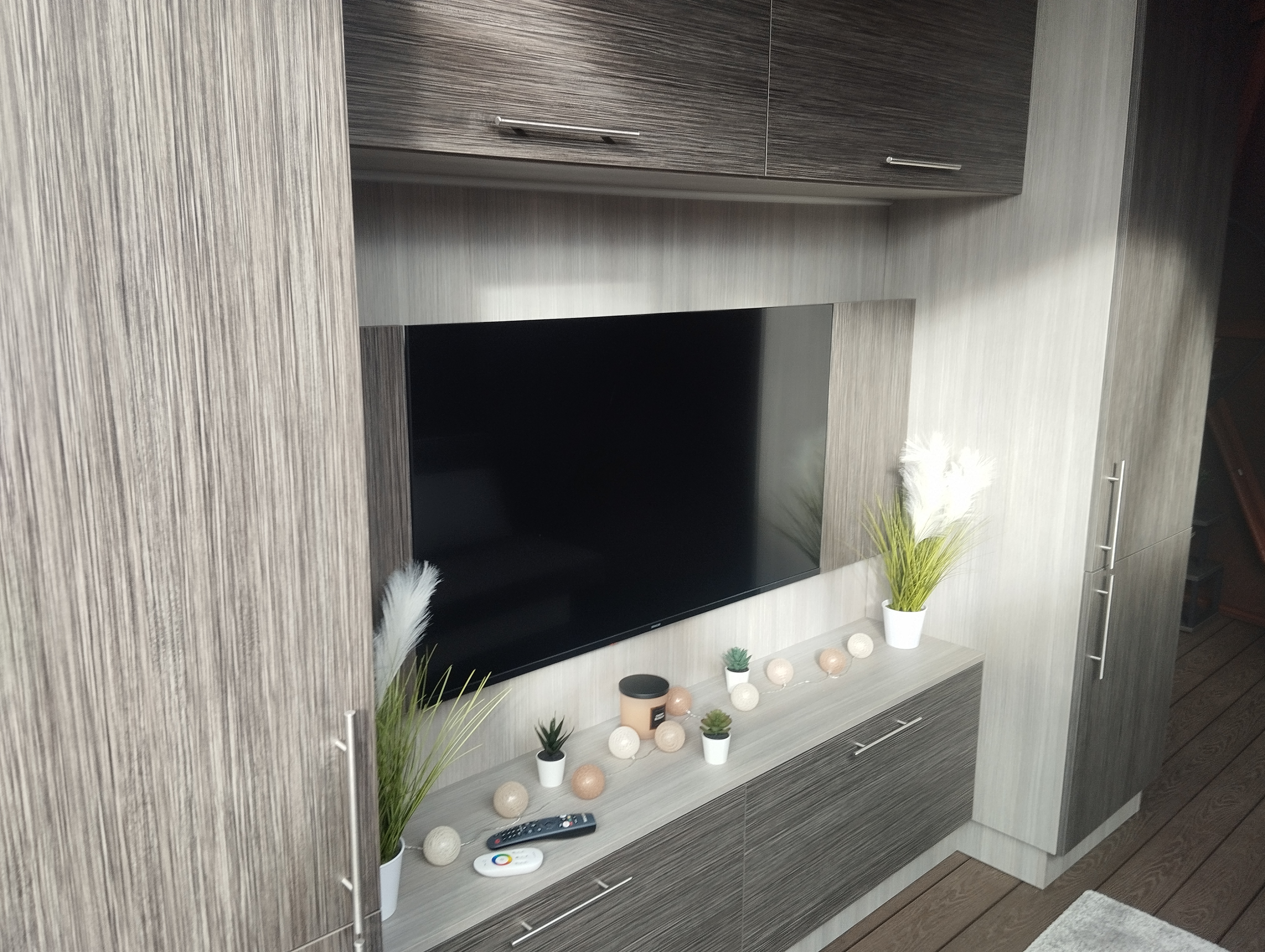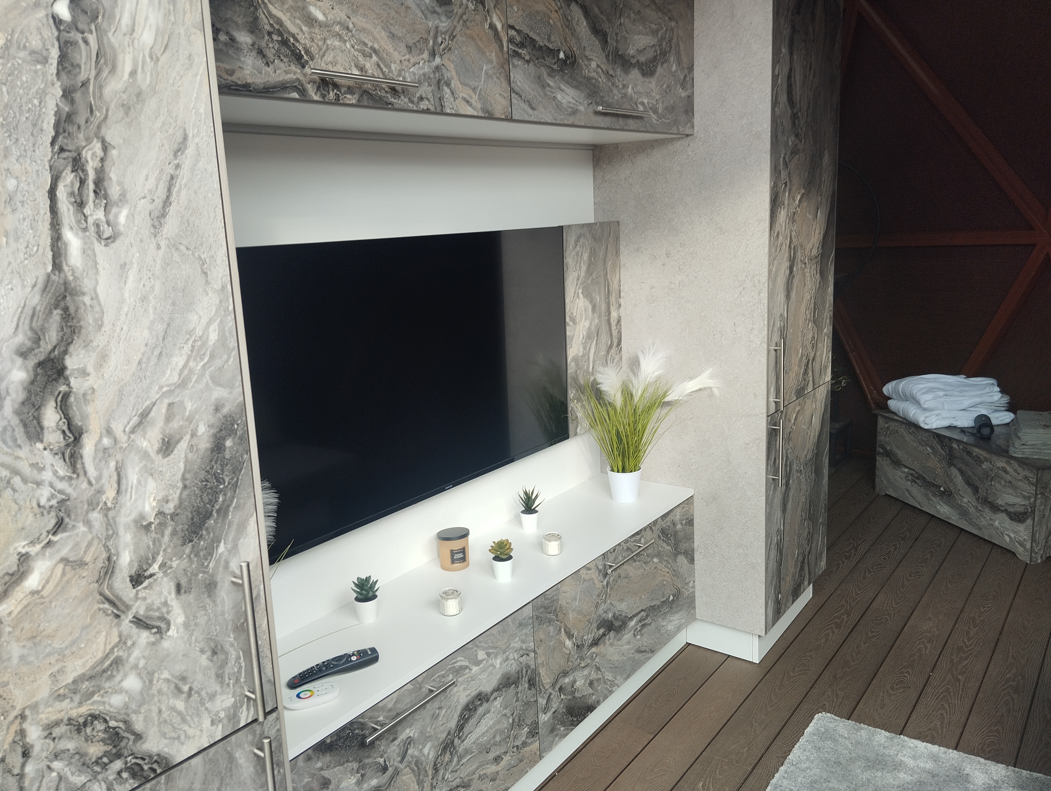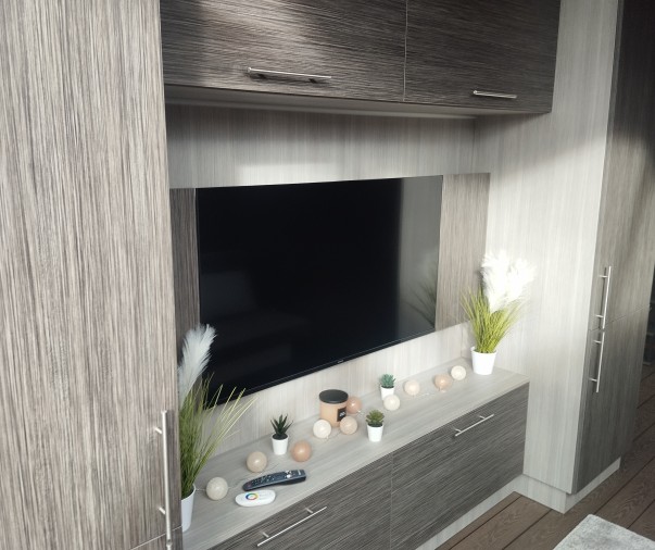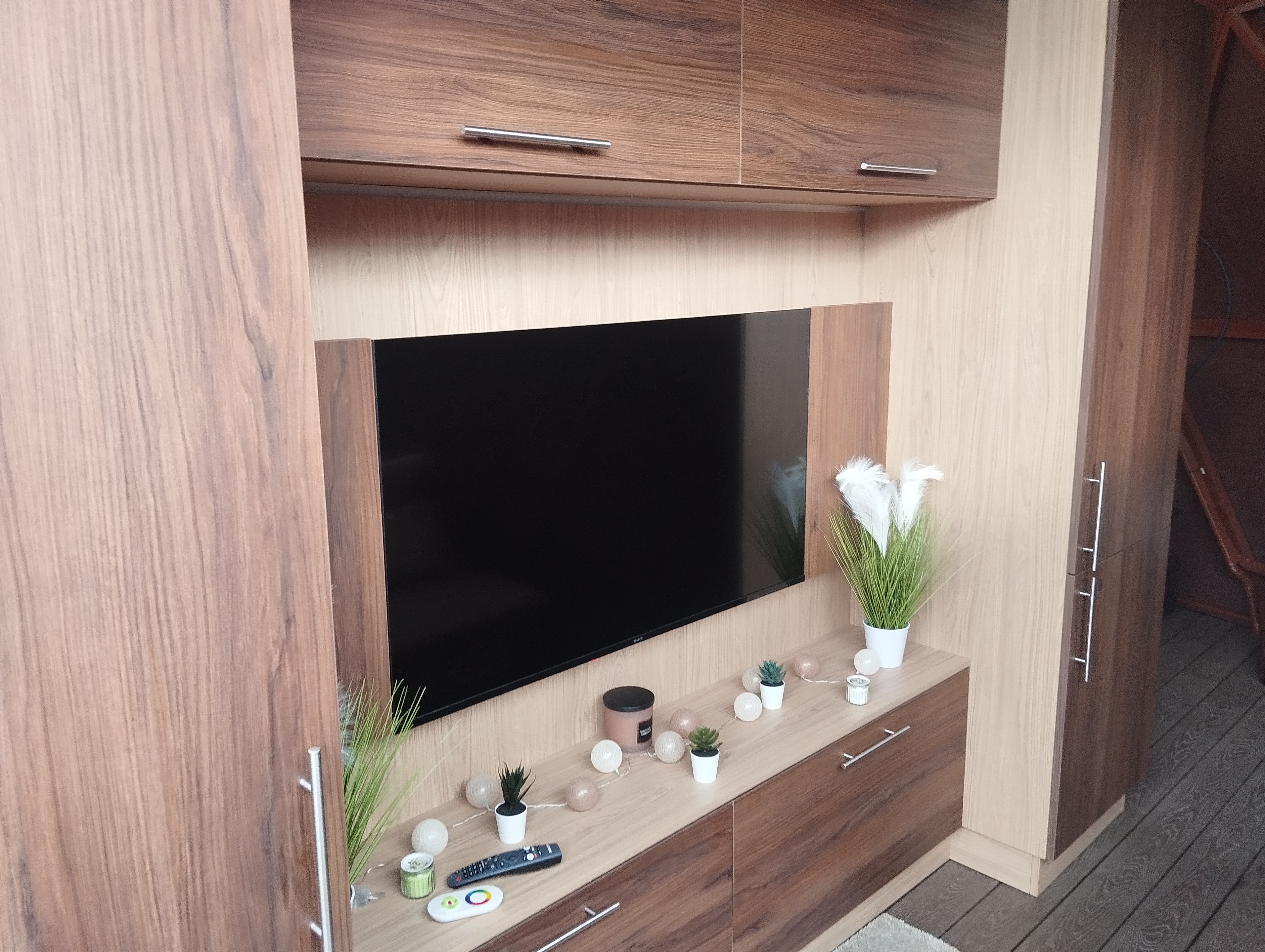 Obývací část - rozkládací pohovka, chytrý televizor s připojením na internet, reproduktor JBL k soukromému využití