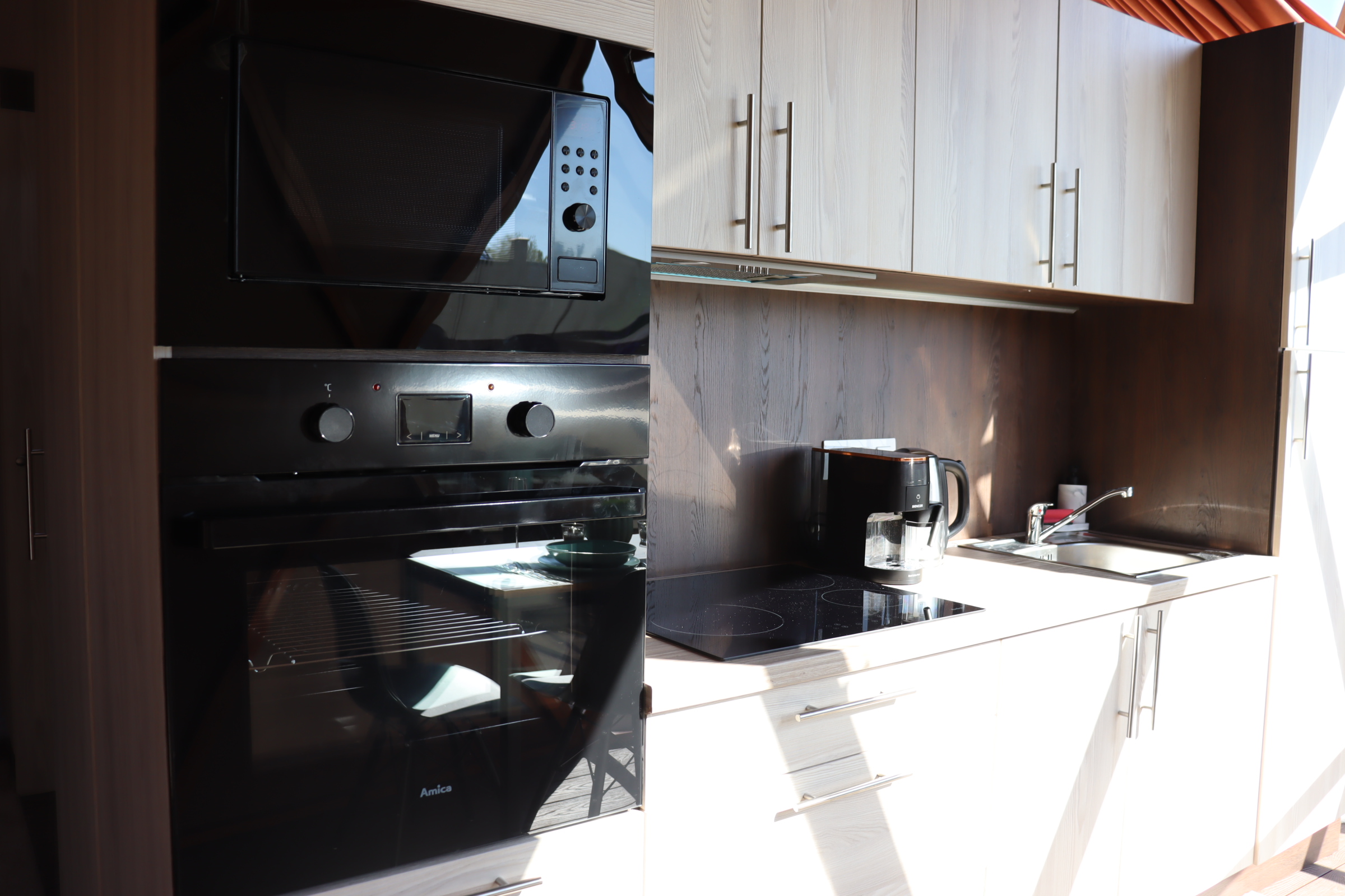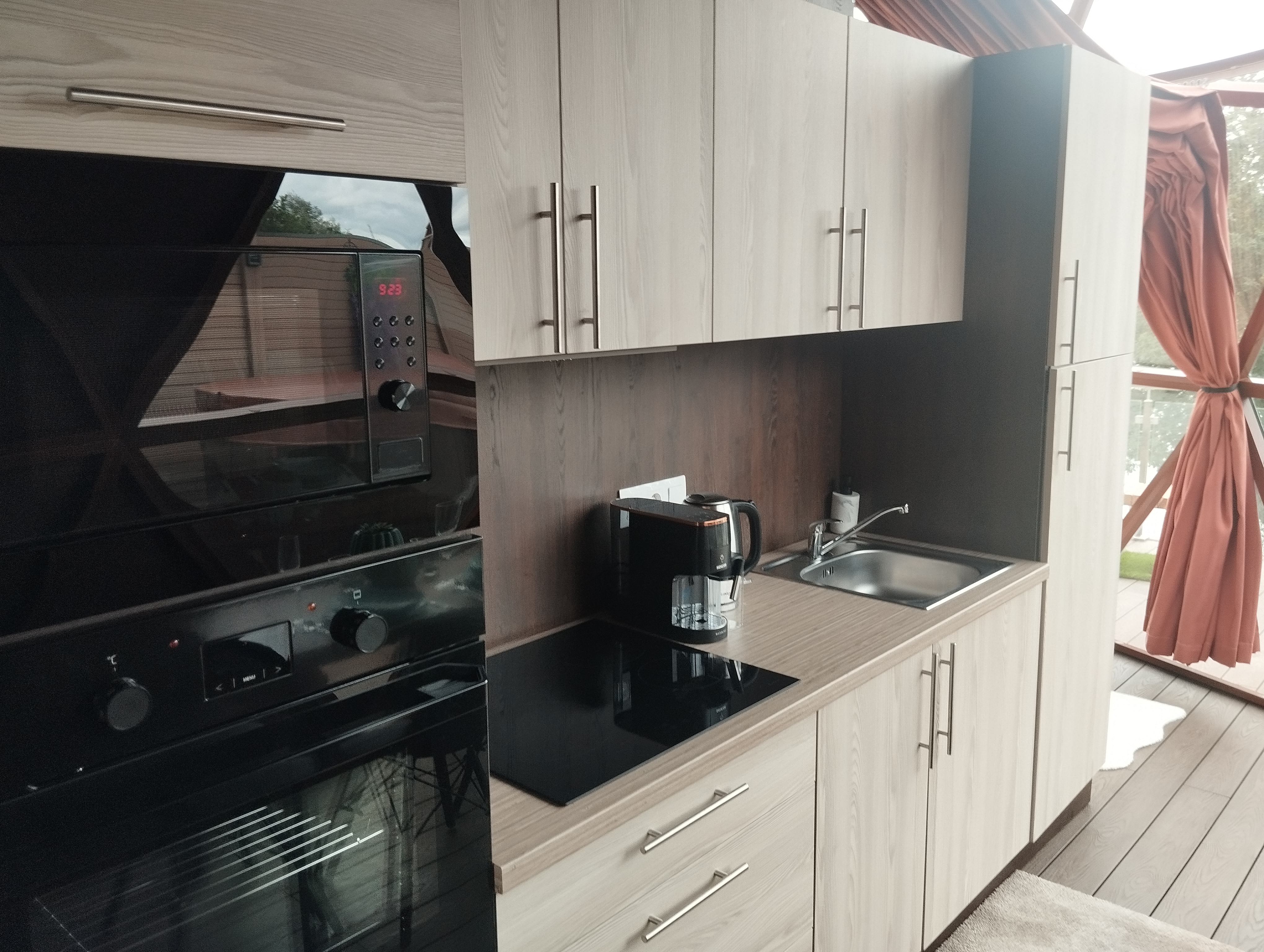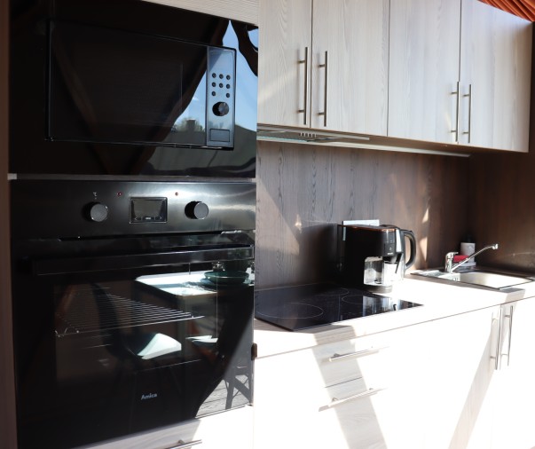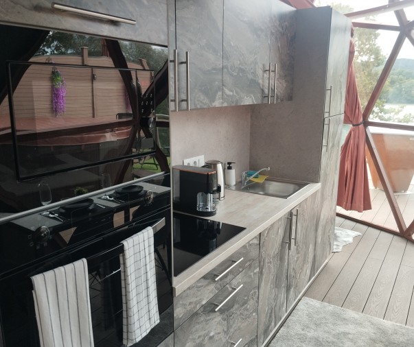 Kuchyň - varná deska, elektrická trouba, mikrovlná trouba, lednice s mrazákem, kávovar a rychlovarná konvice, vybavení na vaření a nádobí, jídelní kout