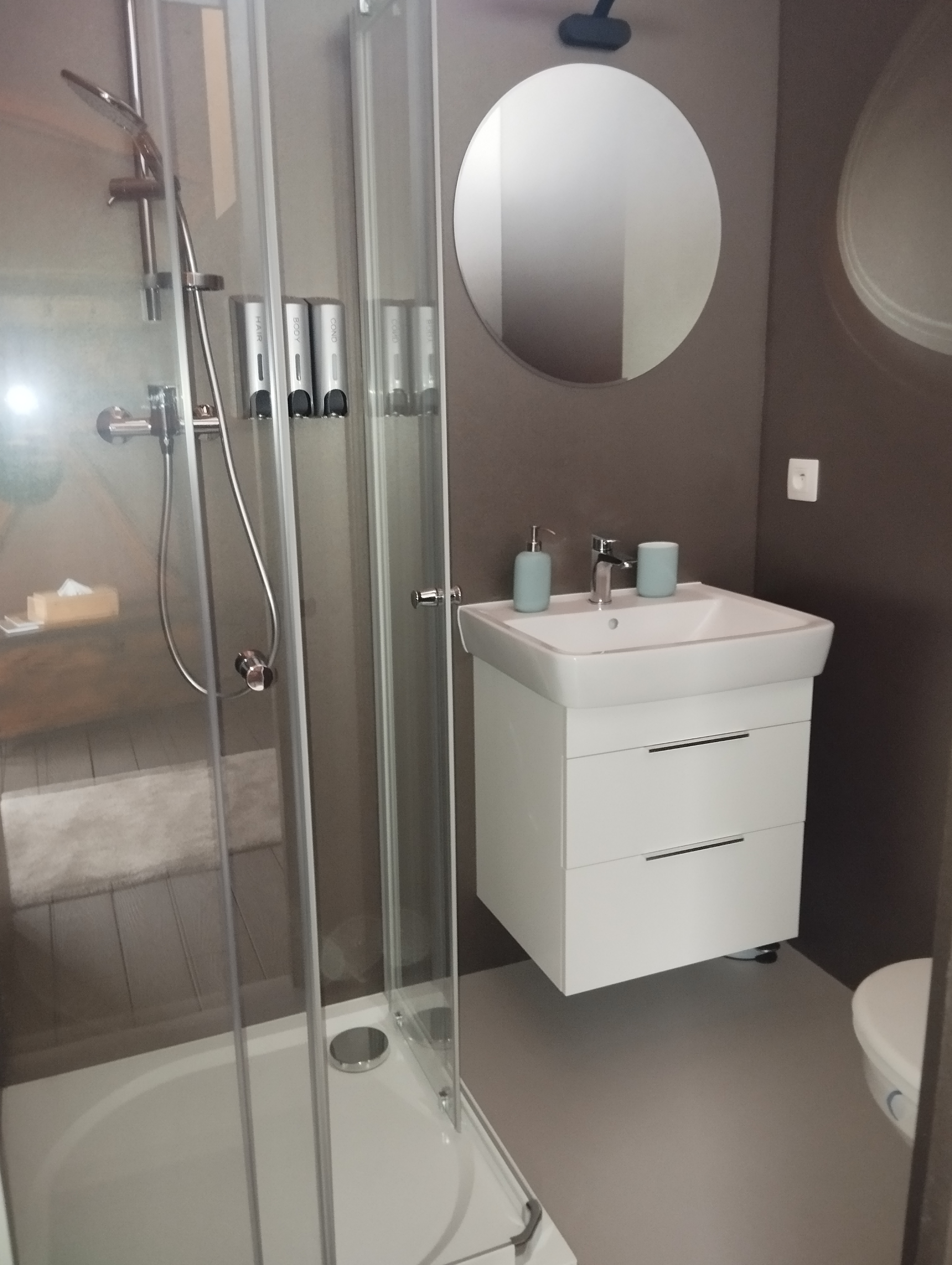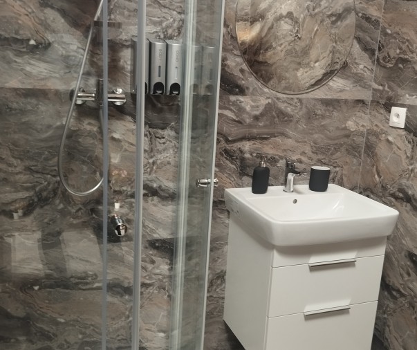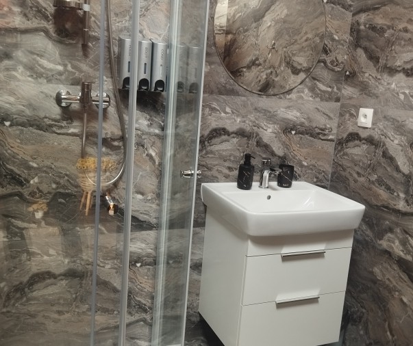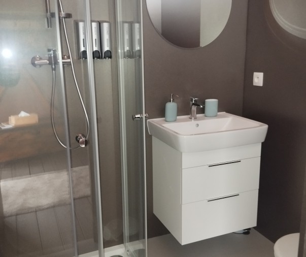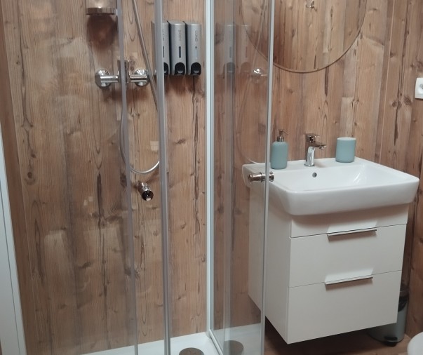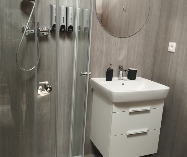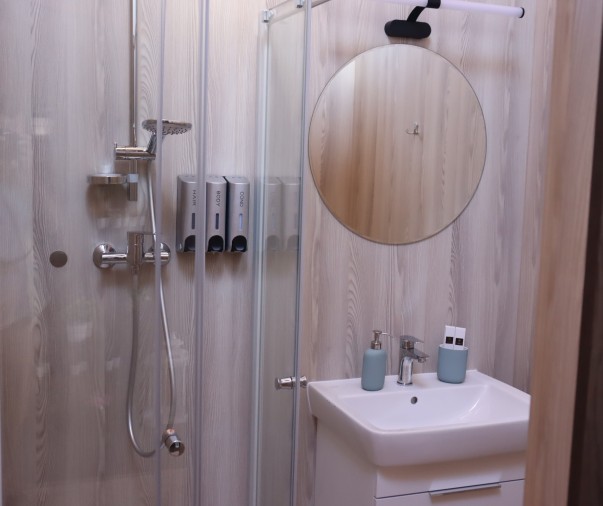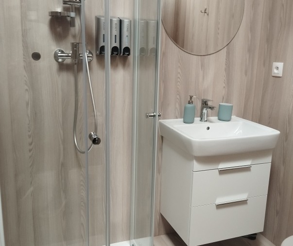 Koupelna a wc - sprchový kout, osušky, ručníky, župany, pantofle, fén, hotelová kosmetika, pánské i dámské hygienické potřeby, sušák na prádlo