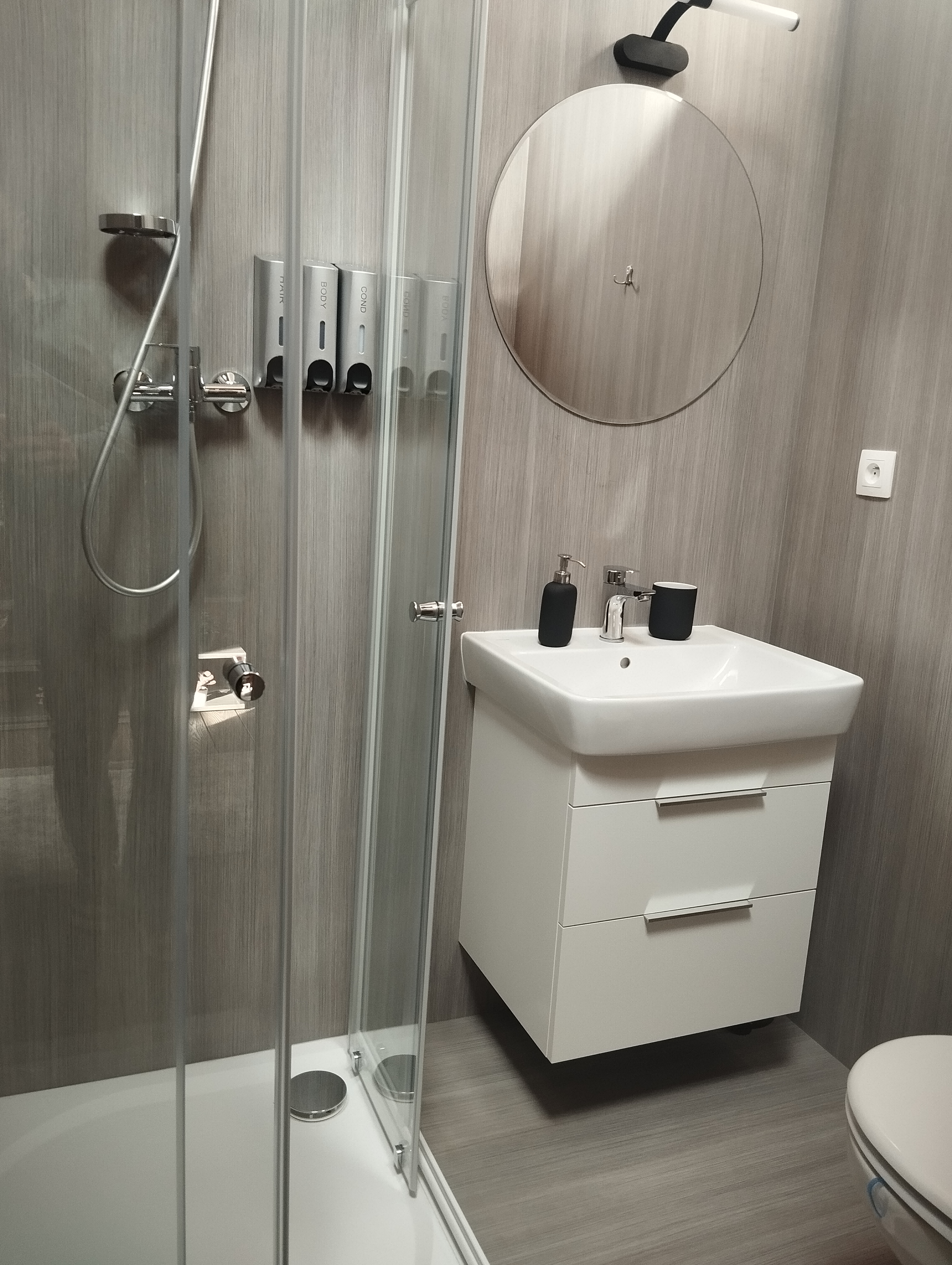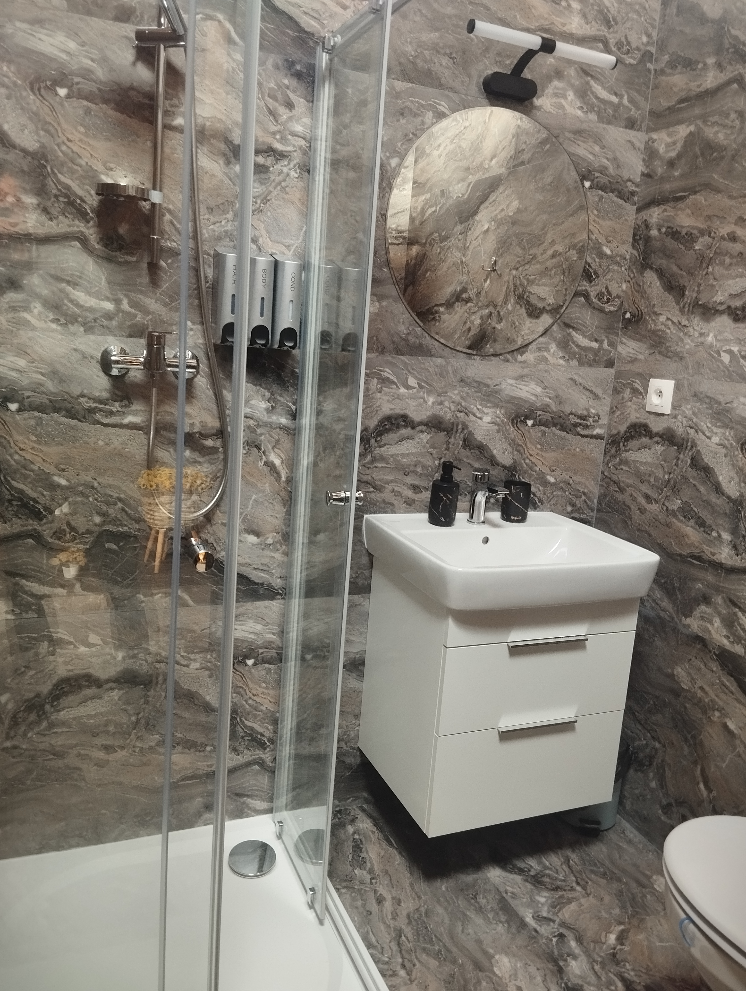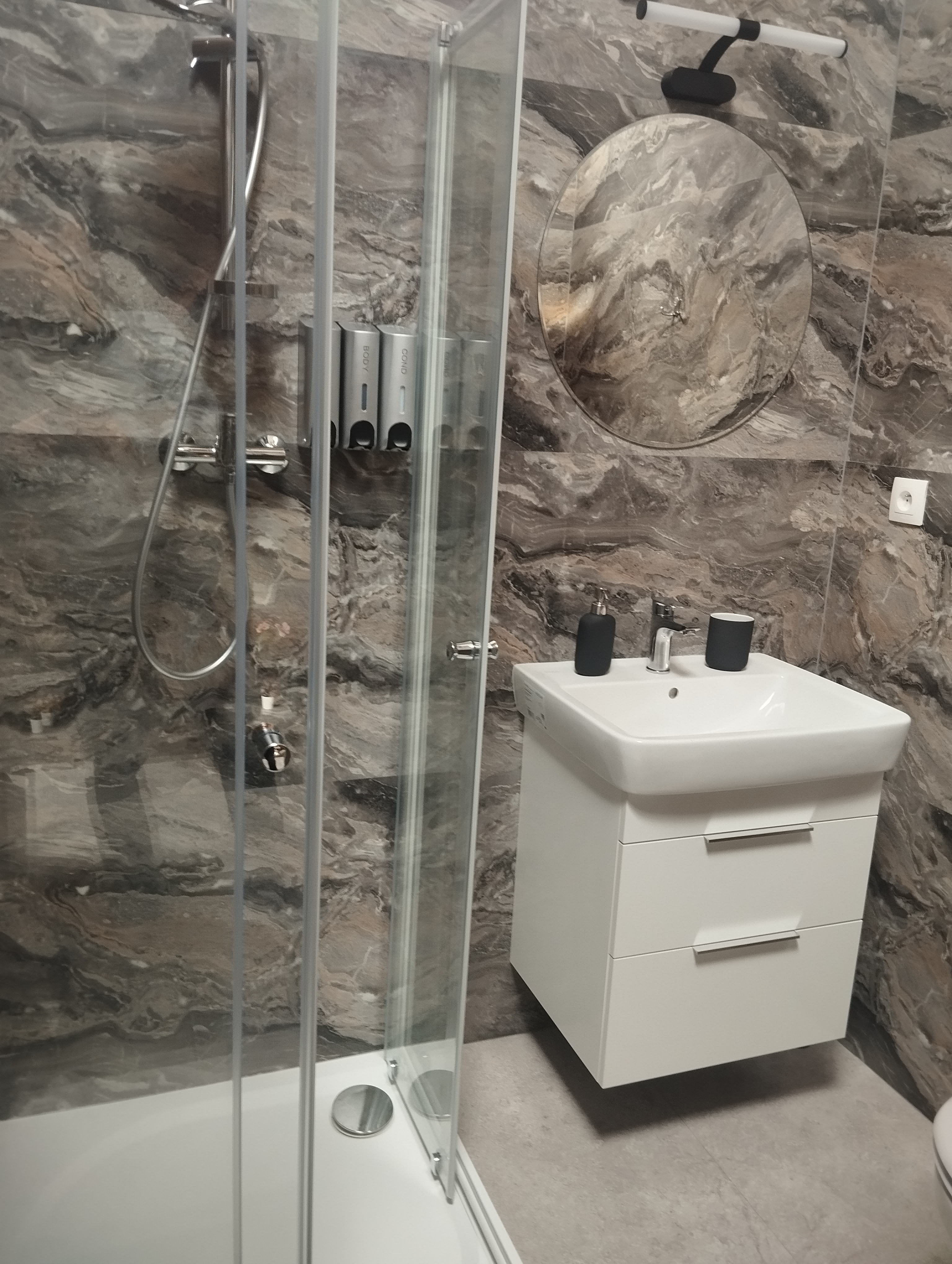 Koupelna a wc - sprchový kout, osušky, ručníky, župany, pantofle, fén, hotelová kosmetika, pánské i dámské hygienické potřeby, sušák na prádlo