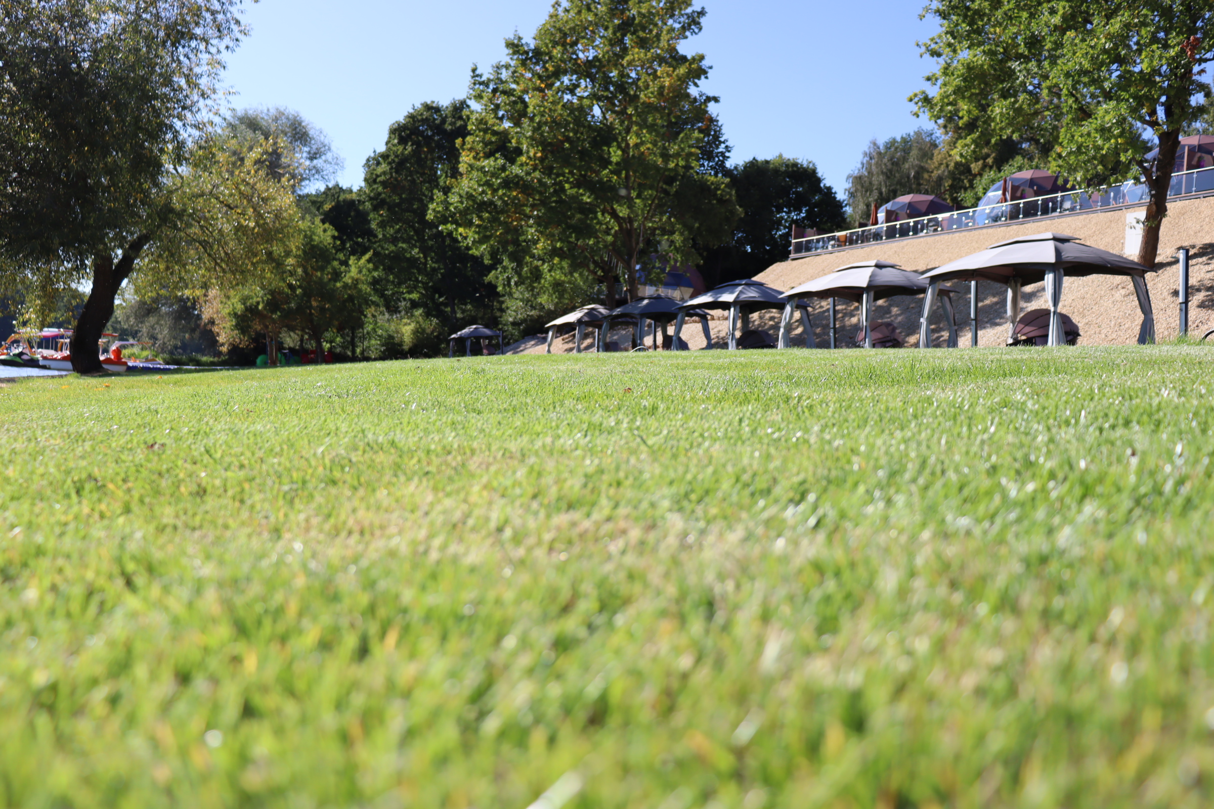 Kombinace perfektně udržovaného anglického trávníku a písečné pláže